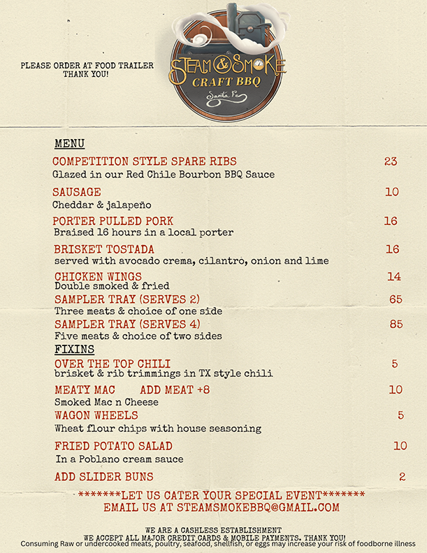 We have a rotating menu. Please visit our Instagram page @steamsmokebbq for the most up to date menu
